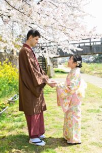 春といえば桜。淡いピンクや白の花びらと、着物の色合いは相性抜群です。